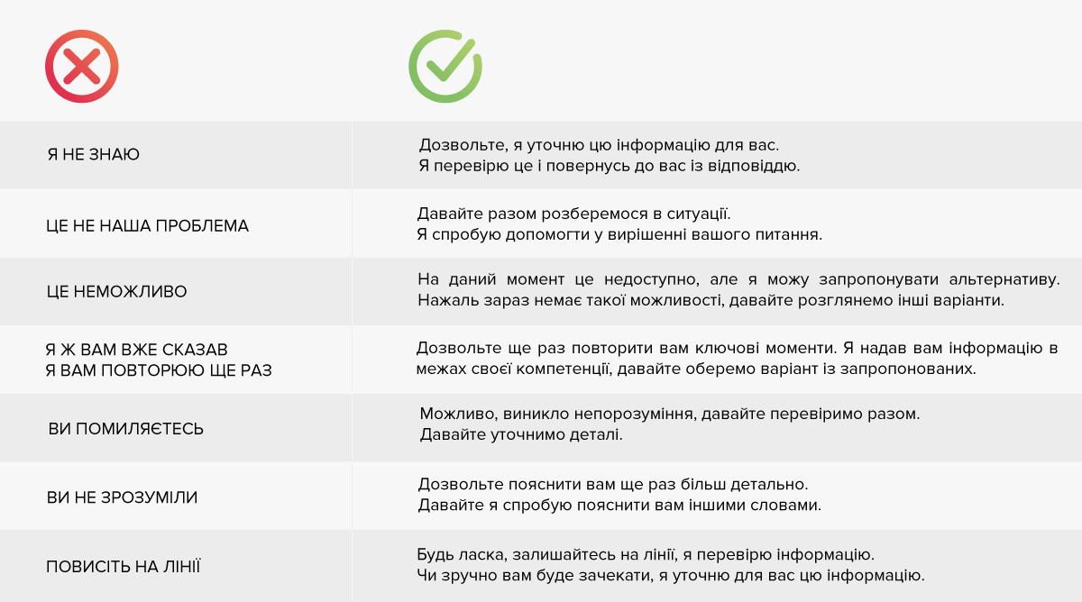 “Я Ж ВАМ ВЖЕ СКАЗАВ / Я ВАМ ПОВТОРЮЮ ЩЕ РАЗ”. Сприймається як роздратування, приниження або звинувачення клієнта.