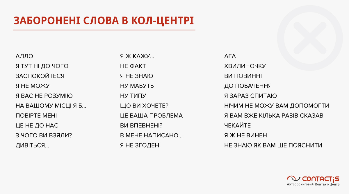 Також ми зібрали перелік слів, які можуть звучати різко та суперечать професійній комунікації. В щоденній роботі операторам контакт-центру слід їх уникати.